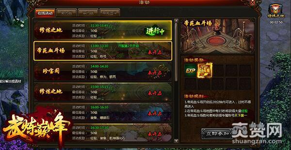 帝苑血斗场是9cb《武炼巅峰》中的一个独特玩法,帝苑血斗场副本在新服开服第二天才会开启,活动持续时间为每日的13:00至13:30。帝苑血斗场活动分为两个部分,活动前20分钟游戏内玩家可以相互厮杀或者击杀副本中BOSS,20分钟内若玩家死亡可以复活。