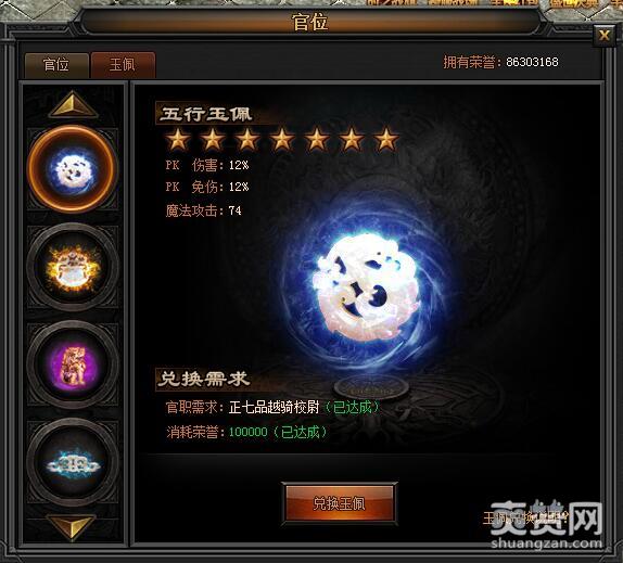 五行玉佩——PK伤害:12%,PK免伤:12%,魔法攻击:74。兑换需要——官职需求:正七品越骑校尉,消耗荣誉:100000。