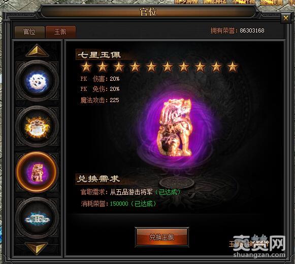 七星玉佩——PK伤害:20%,PK免伤:20%,魔法攻击:225。兑换需要——官职需求:从五品游击将军,消耗荣誉:150000。