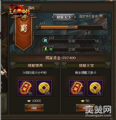 雄图霸业,一统天下!51《三国群雄传》中每个玩家都要为自己的国家做出贡献!正所谓“国家有难,匹夫有责”。在三国群雄传当中,国家捐献有两种方式,一种是捐献银两,一种是捐献元宝,捐献后能获得威望,国家资金也会增长。威望的作用是提升科技,而科技带来的即是战力的极大提升!