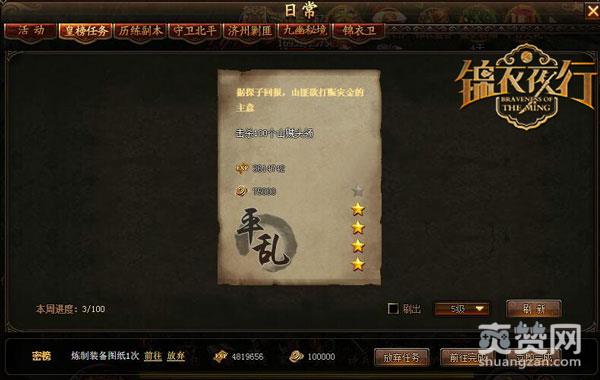 一星二星三星四星五星!皇榜任务以五星为佳。当你刷出五星时,此时的皇榜任务就是密探了,需要你一个人去秘密处理。当然所得的报酬也是丰厚的。在《锦衣夜行》中,玩家可以点击刷5星任务的设置,直到刷出秘密任务为止,每刷一次需要消耗一定数量的钱财,不过每完成一次的任务够你刷了。在任务结束之时还可以选择获得奖励的倍数,我想玩过的玩家都应该清楚,简直美滋滋。