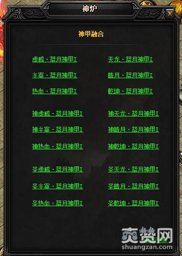 要合成圣天龙·蓝月神甲I,有六种公式。是特有武器作为合成素材,并且需要蓝月神甲作为媒介支撑。
