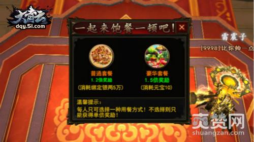 大摆宴席的开启时间是在每天中午12:00-12:30,活动持续半个小时,而且进入门槛非常低,只要满足40级以上就可以进去玩耍,不费吹灰之力就能获得海量经验奖励,这设定对妹子们来说简直不要太亲民。进入以后可以选择你想吃的套餐,目前有普通套餐和豪华套餐两种可以选择。普通套餐需要消耗5万绑定银两,豪华套餐需要消耗10元宝,每人只能选择一种用餐方式。建议大家选择其中一种就餐方式,这样就可以坐下用餐,享受高倍经验;如果不选择,就只能站着看别人吃了,同时经验也只能领取单倍的。