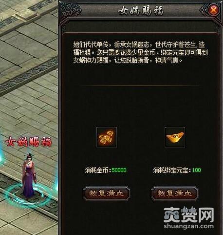 在王城和九州城中新增NPC女娲赐福,点击可消耗少量资源将血量回满!
