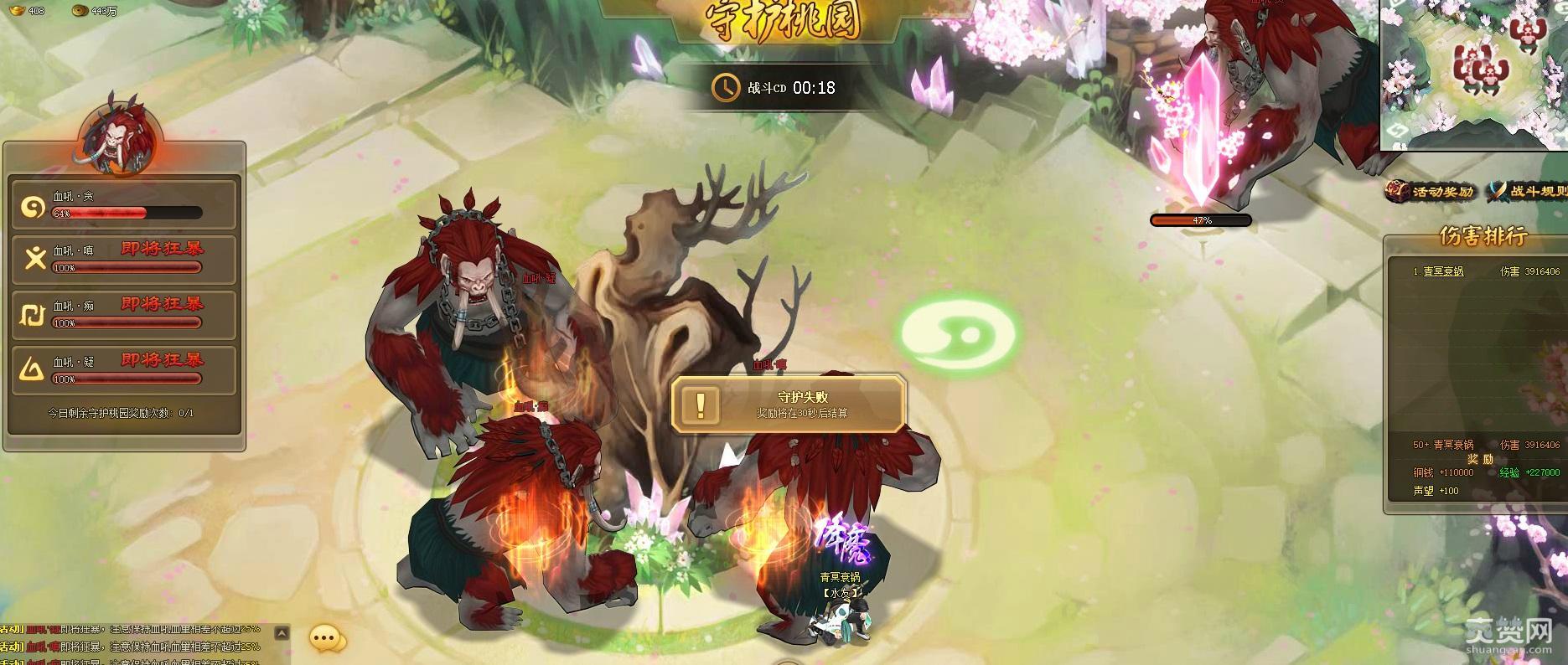 2、保持怪物血量平衡是胜利的关键,若有某只怪物的血量高于其他怪物血量的25%,该怪物狂暴,狂暴后的怪物,将会对桃仙水晶造成大量伤害;每个玩家与怪物进行2回合的战斗,2回合战斗不论结果如果都将结束;