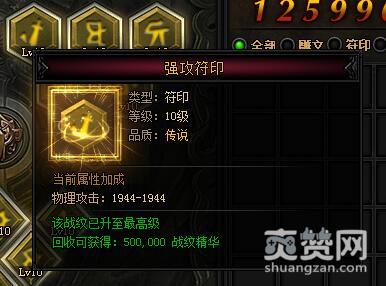 强攻符印。类型:符印,传说:10级,品质:传说。当前属性加成——物理攻击:1944-1944。该战纹已升至最高级,回收可获得:500000战纹精华。