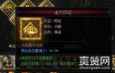 活力印记。类型:印记,等级:10级,品质:传说。当前属性加成——受合击伤害减少:24.0%,该战纹已升至最高级,回收可获得:1,000,000战纹精华。