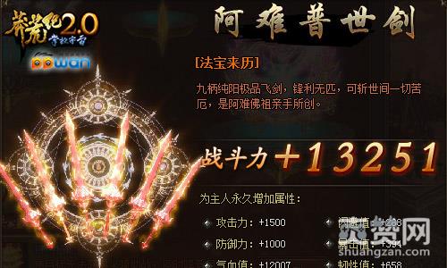 阿难普世剑是ppwan《莽荒纪》中最逆天的法宝,没有之一。阿难普世剑是九柄纯阳极品飞剑,锋利无匹,可斩世间一切苦厄,乃阿难佛祖亲手所创。为主人增加永久属性不必多说,重要的是阿难普世剑还可为主人增加高达13251战斗力,对玩家造成无视防御撕裂空间的伤害,并造成对手当前生命30%的伤害,可主动释放哦!