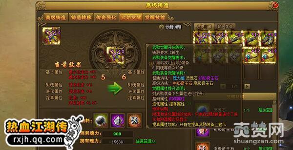 在腾讯《热血江湖传》的高级锻造界面中,可以对武勋装备进行觉醒,武勋觉醒开启需要玩家满足2转生,所觉醒的武勋装备等级需要100级以上,赋魂等级需要12级以上。普通武勋觉醒消耗魂力值、灵魂石、初级奇玉石,高级武勋觉醒消耗中级奇玉石、高级奇玉石。