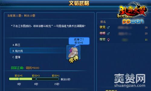 三国事典考开启后,三十道选择题将一一呈现在玩家的眼前,从第一题开始,每过15秒就会自动进入下一题,这也意味着玩家有15秒的思考时间。在ppwan《乱舞无双》中,越短时间内正确答题,可获得的积分就会越多。若玩家在三国事典考中3秒内正确答题,将会获得5积分,3-8秒内正确答题可获得3积分,而在8-15秒内回答正确则只可加1积分。是学神?学霸?还是学渣?三国事典考即可见分晓!