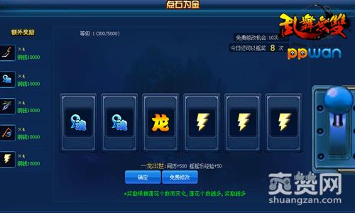点石为金在ppwan《乱舞无双》中是获得铜钱和阅历的活动,无需挑战,无需打斗,只要动手摇一摇,就可以获得大量的阅历和铜钱奖励。当然,这也是需要运气的,在ppwan《乱舞无双》中,当玩家摇到4个相同的道具就可以获得额外的铜钱奖励,当玩家摇到龙字时还可以获得摇摇乐经验,升级点石为金,可获得更多的奖励哦!