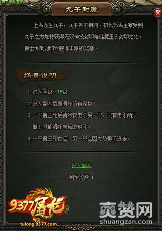 九子封魔是9377《屠龙战记》中的一项日常任务,每天可完成2次,次日零点准时刷新次数,所以为了不浪费挑战次数,下面的内容要认真看哟~!玩家进入9377《屠龙战记》九子封魔地图后,角色要快速向前跑去,此时前方会刷出一波怪物,而玩家要做的就是击败它们!