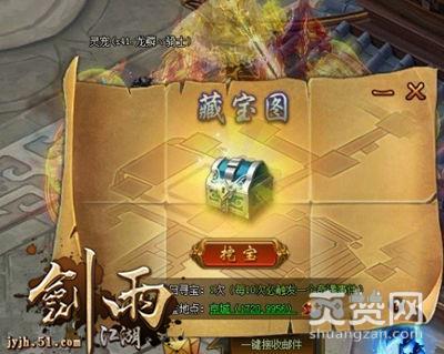 在现实生活中,如果有人拿一张破纸找到你,然后对你说这是一张古代的藏宝图,你一定会毫不犹豫大吼:滚!因为如果是真的,还会拿出来与人共享?铁定是骗子了。51《剑雨江湖》出藏宝图啦,来吧,江湖谣传已久的藏宝图,现在已经浮出水面,真实的出现在诸路英雄面前。还在等什么?赶紧、立马、即刻动身,按照藏宝图的位置,将宝藏挖出来吧!