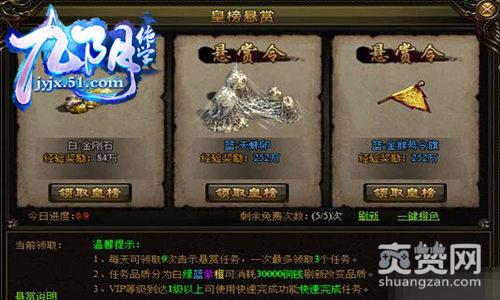 皇榜悬赏任务每天可以获得大量的经验,属于必做的活动。每天可以领取9次悬赏任务,一次最多领取3个任务。任务品质分为白,绿,蓝,紫,橙五种。品质越高的任务获得的经验就越多。可以用3万铜钱来刷新改变品质。升级也是重要的一环。