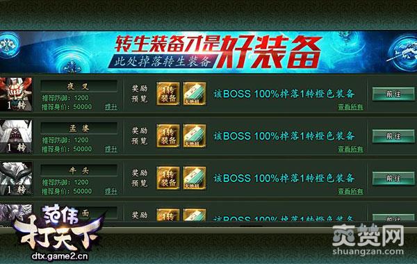 2、转生装备需要BOSS帮忙。为什么这么说呢?在新版《范伟打天下》中,无论是地宫还是轮回殿的BOSS,击杀后必定掉落一件橙色装备。想要极品橙装,就找BOSS要去!