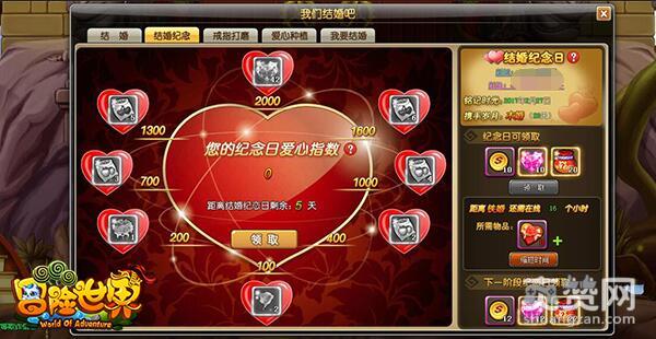 在腾讯《冒险世界ol》中与其他玩家结婚之后,可以开启姻缘界面,姻缘中包含多种结婚玩法,其中尤为耀眼的便是结婚纪念日玩法。从玩家在游戏中结婚的第一天开始,系统便开始记录结婚日期。按照结婚天数的慢慢累积,玩家的婚姻等级也不断提高,纸婚、杨婚、皮婚、丝婚、木婚……直至钻石婚,玩家结婚时间越久,便能得到越高的婚姻等级。