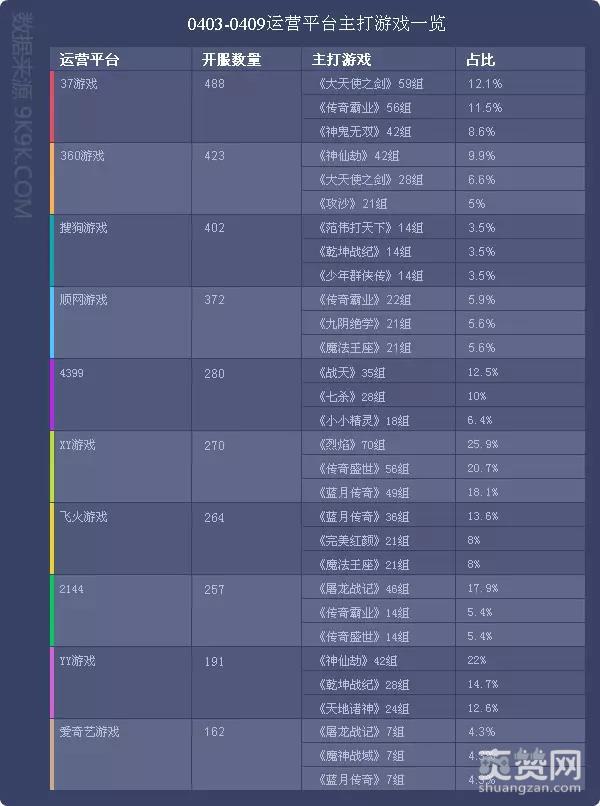 点评:本周各平台主打游戏分布情况未发生太大变化,其中搜狗游戏《乾坤战纪》新晋主打游戏,目前开服频率稳定于2服/天。此外,爱奇艺游戏有多款游戏开服频率均为1服/天。