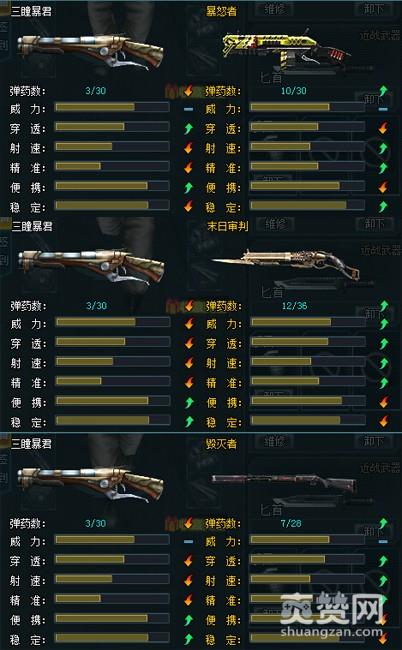 三联装霰弹枪,象征暴君至高的权威,能瞬间倾泻末日般的火力!《4399生死狙击》最新版本陆续都更新好了,除了全新地图上线之外,更有全新霰弹枪“三瞳暴君”登场,自带潜能特效,附加倾泻技能,火力全开,一战到底!《4399生死狙击》官方网站:http://ssjj.4399.com/ 武器名称:三瞳暴君 武器种类:霰弹枪 武器特点:超炫外观、威力强劲、潜能特性、便携性强、稳定性高 武器加成:变异、挑战模式下伤害加成 武器特效: 潜能:永久版武器可激活潜能特性,持续战斗解锁新的外观和称号 倾泻:使用鼠标右键立即清空当前弹匣,向敌人倾泻巨量伤害 获得方式:商城购买 武器对比: