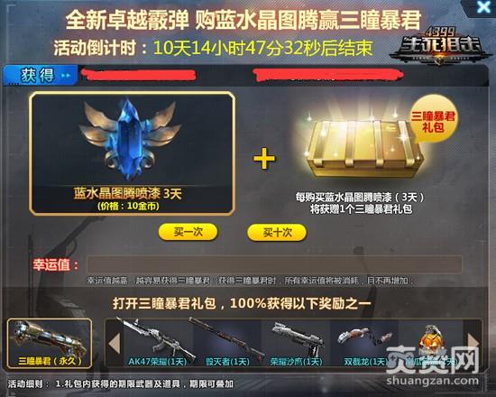 由于版本刚刚更新,小编对于三瞳暴君的具体表现也还没能上手体验。相关评测敬请关注官方网站哦!值得一提的是,版本更新后到4月23日24点,在《4399生死狙击》精彩活动面板内的“三瞳暴君来袭”活动中,购买蓝水晶图腾喷漆(3天),将获赠三瞳暴君礼包哦!具体活动规则进入游戏查看吧!