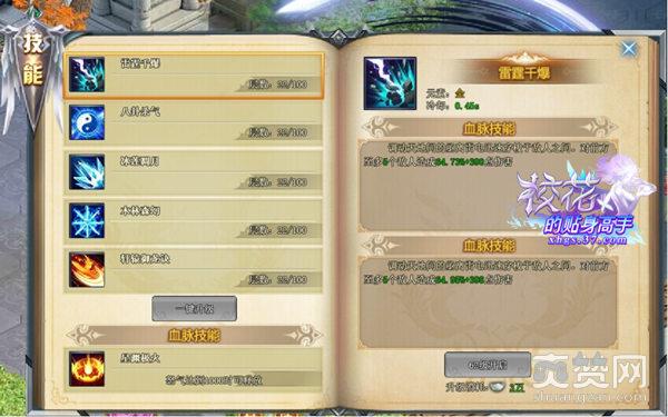 在37《校花的贴身高手》中,【技能系统】当前共有五个血脉技能,点击某技能后,可查看该技能的所用元素(金、木、水、火、土其中之一)、冷却时间、施放效果、伤害数值以及该技能下一等级的提升等,每个技能都有相应的层数,满层为100层,玩家每次想要升级技能层数则需要满足一定的等级要求并消耗相应的银两,才可以升级并获得更好提升。