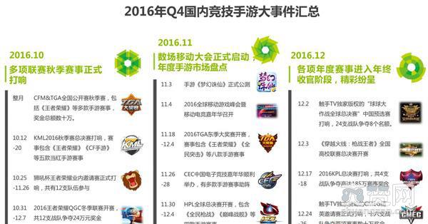 2016Q4,国内共举办了十一场较大型的手游电竞赛事,与Q3相比Q4的手游赛事规模有进一步增长,多项年度赛事迎来年底收官大战。此外,在Q3的二次元手游热潮过后,Q4手游市场未见现象级新兴手游,市场格局并未发生太大变化。