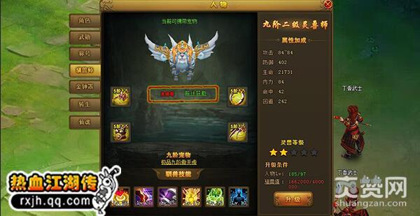 与人物装备系统类似,腾讯《热血江湖传》中的驯兽也有其独特的驯兽装备系统,每个玩家可以同时携带一只驯兽,而驯兽则可以佩戴战盔、兽甲、兽环、利爪共计四个部位的装备。驯兽装备不但可以为主人带来大量的生命值提升,在最新的版本中,通过兽装洗练,还可以使兽装拥有额外的幸运属性。