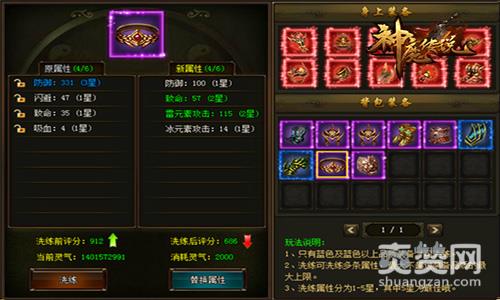 游戏中,玩家消耗灵气即可进行洗炼,洗炼后,装备可以获得额外的属性加成,更可洗炼出稀有属性!根据装备品质,不同品质的装备有不同的属性条数上限。洗炼后,将会给出原属性评分和现属性评分以供参考。如果有不希望被洗炼的属性,可以使用道具洗炼锁,将其所定。锁定后,该属性将不会参与洗炼。