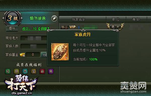 2、捐献虎符,全军出击。如果想要短时间内快速提高家族成员们的全体战斗力,那么捐献虎符一定是最佳选择。一个虎符可以增加家族成员10%的全属性,让冲锋更加给力!