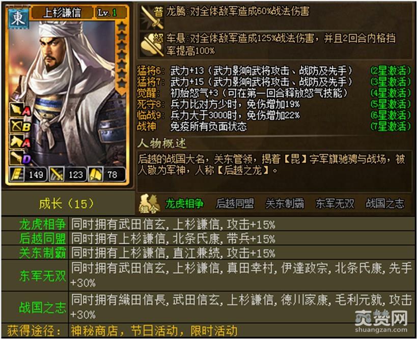 人称“越后之龙”、“北陆的守护神”,是战国时代第一猛将,甚至被誉为“军神”。他是越后代理守护长尾为景幼子,本名长尾景虎,父亲战死越中后,其兄长尾晴景即位,倒行逆施,国内大乱。景虎不足二十岁就起兵平定各地叛乱,反遭晴景猜忌,不得已击败晴景,继任家督和守护大名。