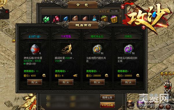 2、绑金还可在随身商店购买金疮药、万年雪霜、随机传送石和回城石。