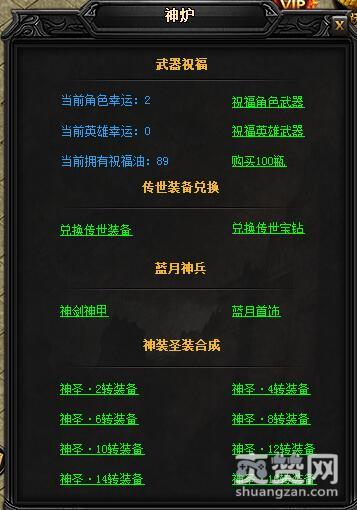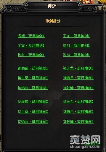 拆分的方法是到神炉处,点击蓝月神兵中的神剑神甲,然后在弹出的对话框中选择一项。这里我们选择的是蓝月神剑I。