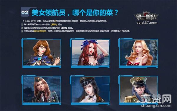 37《第一舰队》特为玩家准备了6位风格迥异的美女,无论是可爱萝莉型,还是高冷禁欲系,她们都将成为你的左膀右臂。活动期间内,玩家每天均有1次翻牌机会,选择喜欢的美女,还将有机会抽中大奖。除此之外,成功领取礼包还可附加两次翻牌机会,千万别和大奖失之交臂!