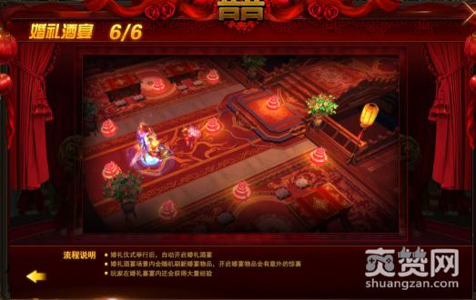 婚礼举行后,会自动开启婚礼酒宴。宴请八方宾客,,酒宴内会随机刷新婚宴物品,宾客开启婚宴物品会有以外的惊喜哦