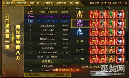 看看跨服总榜,如果积分高达上百万就能上榜,上榜的好处是什么呢?珍贵的一品/二品/三品攻击石选鉴箱都是你的。