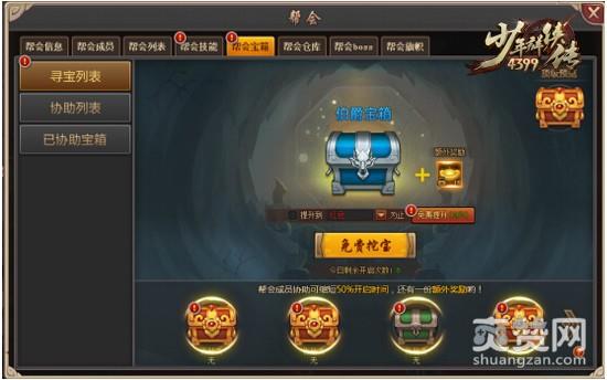 1、帮会成员可以挖掘帮会宝箱获取宝箱奖励,挖掘宝箱可以求助其他成员协助开启宝箱,其他成员协助开启宝箱则挖宝者可获得额外奖励。2、协助其他成员挖掘宝箱获得协助奖励。