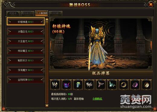 在游戏当中,每个玩家都拥有单挑强大BOSS的机会,点击激战BOSS图标,可以进入个人BOSS界面进行挑战。个人BOSS根据等级依次开放,等级越高,可以挑战的BOSS越强大。每个BOSS每天都可以挑战1-2次,进去后无论是否成功击杀BOSS次数都会消耗,进入之前一定要做好准备。高等级的个人BOSS地图需要消耗副本卷轴才可进入,副本卷轴可在藏宝阁掉落或花费绑元购买。