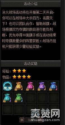 成功进入冰火战场会被随机分为2队,进行夺旗和PK,PK时不会受到任何惩罚。活动期间内,会有旗子的固定刷新点,玩家可以抢夺旗子,成功归还本方阵营可以获得500积分,同时本阵营所有玩家都可以增加50点积分。