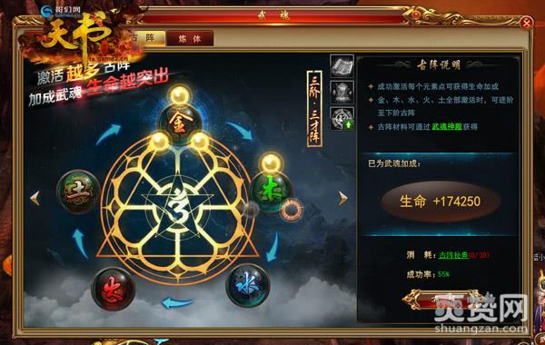 哥们网《天书世界》古阵,每一阶分为金、木、水、火、土五个部分,每一部分有三个元素点组成。玩家每激活一个元素点,就可以为武魂带来生命属性加成。