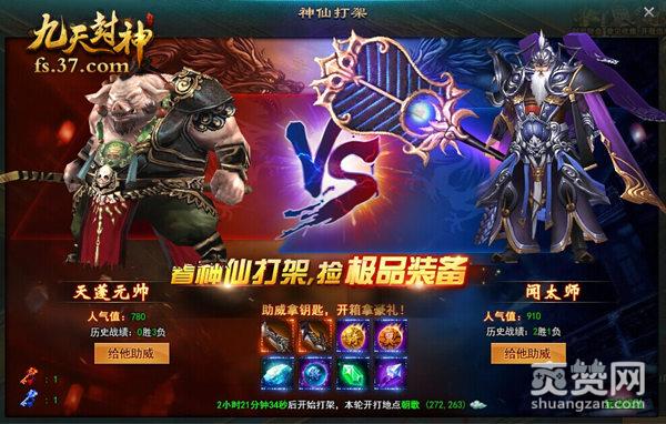 原来【神仙打架】是37《九天封神》的一个新玩法,在游戏开服前7天,当玩家达到40级即可参加神仙打架活动,游戏中,强力BOSS将会定时定点进行互殴,玩家可根据喜好选择助威的BOSS拿钥匙,还能去场地围观BOSS之间强力的对战,并且用钥匙开启打架过程中掉落的宝箱。