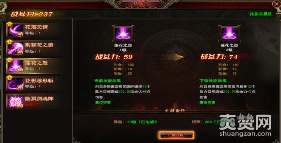 初级玩家会看到凰影一共拥有五大技能,傲天完美红颜游戏里随着等级的攀升技能会不会越来越多,这个就留给大家去考证吧。什么落花无情、荆棘花之袭、莲花之怒、花影移形斩,无一不与花朵有关。最霸道的却不是这四大技能,而是最后一项“幽冥剑魂阵”。想要提升技能,首先需要升级等级,其次还要拥有大量银两,这样才能帮助技能快速升级。点击“一键升级”迅速就完成了技能提升,非常方便。