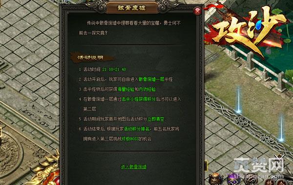 2、骸骨废墟共有三层,勇士通过击杀小怪积累积分进入第二层,活动结束后,系统将根据积分排名让前五名勇士进入第三层挑战终极BOSS;