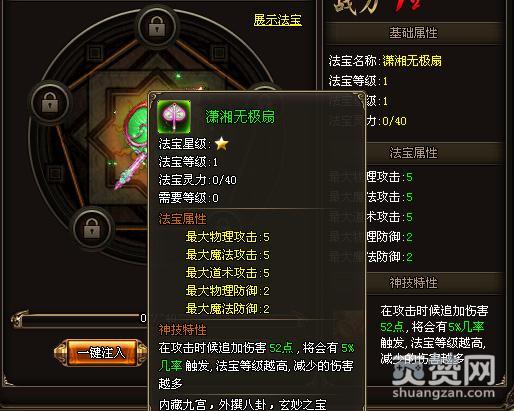 法宝多为神话传说中能降妖伏魔的宝贝,像孙悟空的金箍棒、铁扇公主的芭蕉扇。在923yx《烈火战神》中,你也能拥有属于自己的法宝,而且法宝还可以增加玩大家的实力哦!