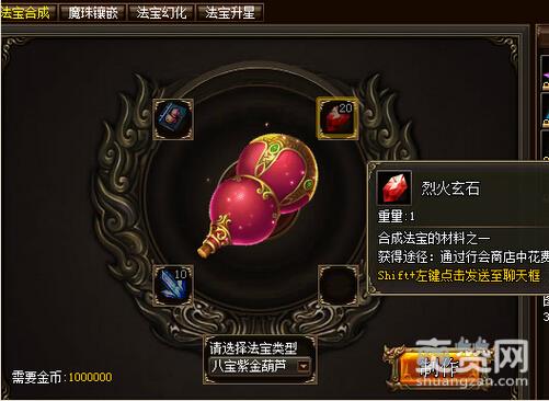 在923yx《烈火战神》中,法宝是杀人越货必备的道具。而且法宝不仅能增加大家的最大攻击、防御,它还有一个最大的特点就是具有独一无二的特性技能。大家可以合成3种不同的法宝,合成法宝需要获得20个烈火玄石、10个天地结晶以及一个图谱和100W金币。