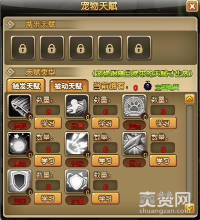 玩家等级达到60级,宠物就能携带天赋了.宠物天赋分为触发天赋和被动天赋,触发天赋是主动天赋,只在宠物跟随且携带此天赋的情况下才生效;被动天赋是被动技能,只要学习过被动天赋,无需装备,永久生效.玩家最多可以携带5个天赋,携带的天赋在宠物跟随的情况下可以触发.