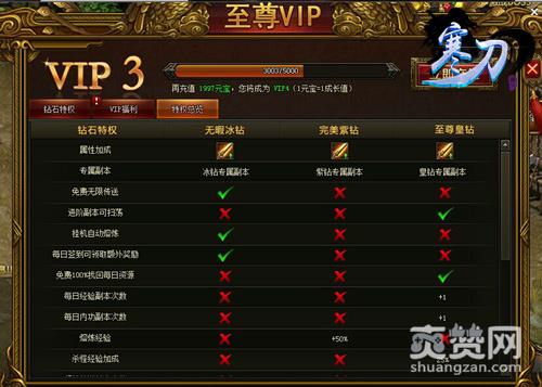 在9377《寒刀》中,玩家打开VIP面板中能查询到自己当前的VIP等级和经验,升级VIP可以领取各种珍贵的资源。不同的VIP等级所对应的累计充值元宝数不同,官方这次赠送的VIP4所对应的充值元宝为5000,等于给大家节省了一大笔钱钱呢,不用充值就能享受到永久免费传送、增加杀怪经验、一键完成任务等不一般的尊贵特权,感觉赚了1个亿~!