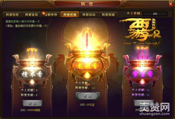 每一位上战场的勇士,不管是他的朋友还是家人,都希望他能够平平安安地回来,所以在古代,祈福成了一项打仗前必要做的事情。在37《西游伏妖篇》里,阵营祈福界面可消耗铜钱,礼金或元宝上香祈福,还能获取贡献奖励。此外,阵营活动目前开启了阵营竞猜和阵营膜拜,爱凑热闹的玩家每天要记得参加哦!