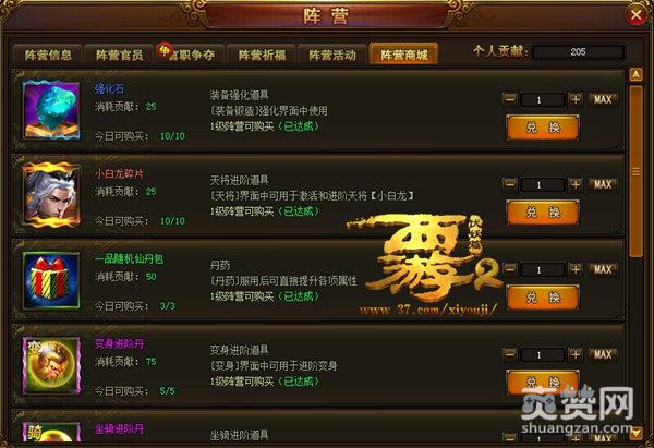 既然是阵营的一份子,37《西游伏妖篇》的玩家肯定要为自己的阵营贡献出一份力,在阵营信息界面点击阵营捐献按钮,可选择令牌,铜钱,元宝进行贡献,完成之后玩家可以获得大量阵营贡献。