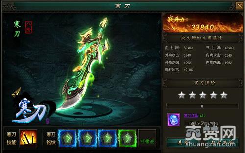 除此之外,玩家大侠还可以在9377《寒刀》寒刀品阶到达4阶时开始装备寒刀铭纹。在游戏中,寒刀铭纹能为玩家增加更多的额外属性。9377《寒刀》寒刀铭纹共分为12阶,玩家可通过荣誉商城、特定活动获得寒刀铭纹。