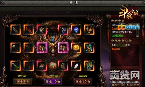 目前,寻宝有三种方式,寻宝1次、寻宝10次和寻宝50次。在ppwan《斗破沙城》中,寻宝1次需要花费200元宝,寻宝10次需要1950元宝,寻宝50次则需要9500元宝。在寻宝的过程中,虽然是看玩家的运气,但是玩家寻宝的次数越多,所花费的元宝就会越少,可能出极品装备的概率就会越高!