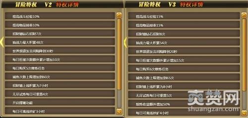 玩家累计登录2天,可以升级到冒险特权V1;玩家累计登录5天,可以升级到冒险特权V2;玩家累计登录15天,可以升级到冒险特权V3;玩家累计登录60天,可以升级到冒险特权V4;玩家累计登录120天,可以升级到冒险特权V5;玩家累计登录200天,可以升级到冒险特权V6.冒险特权V1~V6,只要玩家持之以恒的登录,无需花费,特权免费升级.